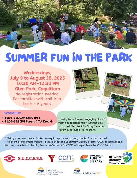 Come to Glen Park in Coquitlam on Wednesdays for some summer literacy fun! 🎶 🍎For families with children birth to 6 years old. 🙏Happening every Wednesdays at Glen Park until August 28th! Bring your own comfy blanket, mosquito spray, sunscreen, snacks and water bottles! Schedule for Summer Fun In the Park: 10:30 - 11:00 am Story Time 11:00 -12:30 pm Parent & Tot Drop-In 👏No registration needed. Check out Coquitlam Public Library or YMCA Child Care Resource and Referral for more info. (fb)