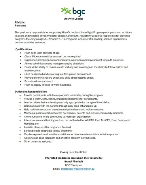 Buy Raffle Tickets WELCOME TO BGC THOMPSON BGC Thompson is a leading provider of quality after school and outofschool programs to children and youth. After School Program We provide recreational after school programming for children ages 5 12 in a welcoming and inclusive environment. LateNight Program The LateNight Program is a youth dropin centre for youth within the ages of 12 17 years. This program provides them with a safe inclusive place to make new friends have some fun and feel supported.