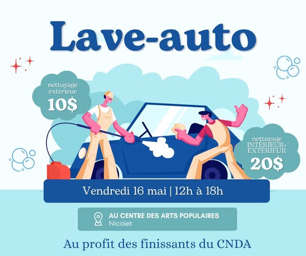 🚗 LAVE-AUTO FINISSANT – 16 MAI 🎓 Nos finissants vous attendent ce vendredi 16 mai pour un lave-auto de financement en vue de leur bal! 📍 Centre des beaux-arts de Nicolet 🕐 12h à 18h 💦 Lave-auto à petit prix: 👉 10 $ pour un lavage extérieur; 👉 20 $ pour un lavage intérieur et extérieur Merci pour votre soutien! 🙌 (fb)