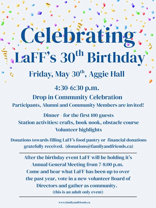 You're invited! 🎊 Come celebrate with us on Fri, May 30. Everyone is invited - families, alumni, community, supporters, etc. We will be celebrating LaFF's 30 years of supporting families and building community. 🥳 #ilovetolaff (fb)