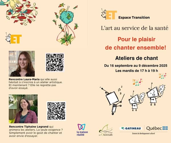 Tu as entre 18 et 25 ans et tu cherches une activité pour décrocher, te changer les idées ou juste faire du bien à ta tête et à ton corps ? Viens essayer nos ateliers de chants ... «Pour le plaisir de chanter ensemble» C'EST QUOI AU JUSTE ? 12 ateliers relax, inclusifs et vraiment l’fun pour chanter et réaliser un projet ensemble sans pression. Pas besoin d’expérience. Pas besoin de savoir chanter. Tu viens comme tu es… et tu repars souvent plus léger.ère. Et oui, c'est GRATUIT ! 🎶 POURQUOI ESSAYER ? • Pour le plaisir de chanter et créer des liens • Pour l’ambiance décontractée sans jugement • Pour le sentiment d’appartenance et le boost de fierté et de confiance 🎥 Rencontre LAURA MARIA qui elle aussi hésitait à s’inscrire. Et maintenant ? Elle ne regrette pas d’avoir fait le premier pas : https://vimeo.com/686439966 🎥 Découvre TIPHAINE LEGRAND, notre cheffe de chœur, qui animera les ateliers : https://vimeo.com/1101043440/73734ea7c0?share=copy 📅 QUAND ? Du 16 septembre au 2 décembre 2025 Tous les mardis de 17 h à 19 h Église Saint-François-de-Sales 🎉 Mini show : 9 décembre 2025 👥 Pour tous les jeunes adultes de 18 à 25 ans, avec ou sans enjeux de santé mentale. 👉 Pour plus d’information ou pour t’inscrire, communique avec Audrey Kingsbury : suivicom@maisonrealite.org 418-803-1580 👉 Connais-tu une personne qui pourrait bénéficier de cette expérience artistique, humaine et inclusive ? N'hésite pas à lui partager cette publication ! Ce projet est réalisé par le Chœur classique de l'Outaouais en partenariat avec Maison Réalité et Espace Transition- Etpsy.ca #JeunesAdultes #ProjetInclusif #ActivitéPourJeunes #18_25ans #AteliersDeChant #SantéMentalePositive #BienÊtreJeunesse #prendresoindesoi #maisonréalité *** You're between 18 and 25 and you're looking for an activity to get away from it all, take your mind off things or just do something good for your head and body? Come and try our singing workshops ... "For the joy of singing together" WHAT IS IT ? 12 workshops — chill, inclusive, and seriously fun, to sing and carry out a project together. No singing experience required. No singing experience required. Just come as you are, and chances are, you’ll leave feeling lighter. And yes, it's completely FREE! WHY GIVE IT A TRY? - To enjoy singing and connect with others - For the relaxed, judgment-free vibe - For the sense of belonging, confidence, and pride it brings 🎥 Meet LAURA MARIA who also hesitated before joning an art workshop. Now? She's glad she took bat first step: https://vimeo.com/686439966 🎥 Meet TIPHAINE LEGRAND, our musical director, who will lead the workshop: https://vimeo.com/1101043440/73734ea7c0?share=copy 📅 WHEN? September 16 to December 2, 2025 – Tuesdays, 5 to 7 p.m. St-François-de-Sales Church 🎉 December 9, 2025 – Mini show 👥 Open to young adults aged 18 to 25, with or without mental health challenges 👉 Want more info or want to sign up? Reach out to Audrey Kingsbury (Maison Réalité) suivicom@maisonrealite.org 418-803-1580 👉 Do you know someone who might benefit from this artistic, human, and inclusive experience? Don't hesitate to share this publication! This project is produced by the Chœur classique de l'Outaouais in partnership with Maison Réalité and Espace Transition (fb)