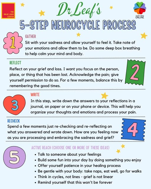 In the latest episode of Rick Hanson, Ph.D.'s Being Well Podcast, he speaks to Dr. Caroline Leaf about the power of neuroplasticity and how to work through mental mess - for adults and kids! Listen to the episode at https://www.rickhanson.net/being-well-podcast-neuroplasticity-tools-to-change-your-and-your-kids-brain-with-dr-caroline-leaf/ and check out our infographic for a guide to Dr Leaf's 5-step Neurocycle Process for grief. #Grief #OvercomingGrief #Neuroplasticity (fb)
