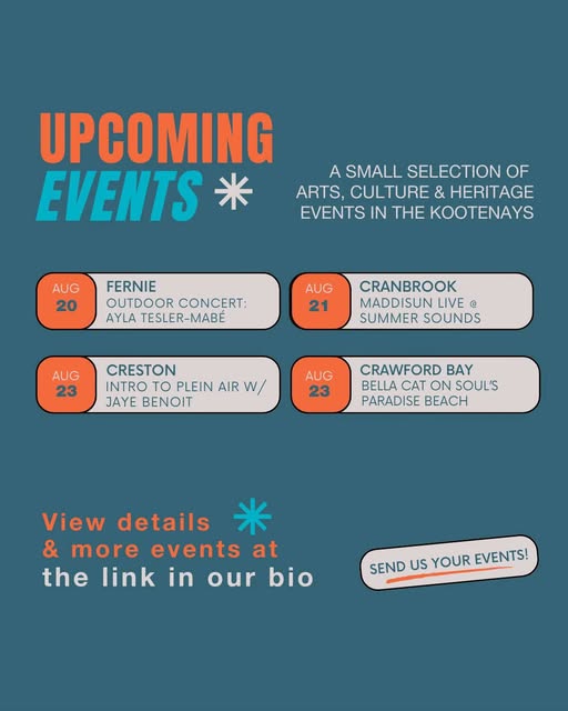 There are just a few weeks of summer left, but the outdoor concert series and plein air events are still going strong in the #columbiabasin region! 📌 Fernie - Wednesday, August 20 Wednesday Socials Outdoor Concert Series: AYLA TESLER-MABÉ 📌 Cranbrook - Thursday, August 20 Maddisun Live at Summer Sounds 📌 Creston - Saturday, August 23 Intro to Plein Air w/ Jaye Benoit 📌 Crawford Bay - Saturday, August 23 Bella Cat on Soul's Paradise Beach Visit our calendar for even more arts, culture, and heritage events (and submit yours!) https://www.wkartscouncil.com/events/category/calendar/ (fb)