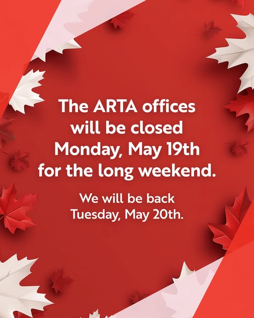 The ARTA offices in both Edmonton and Calgary will be closed Monday, May 19th for the long weekend. 🍁 We will be back on Tuesday, May 20th. Wishing you a sun-filled weekend! (fb)