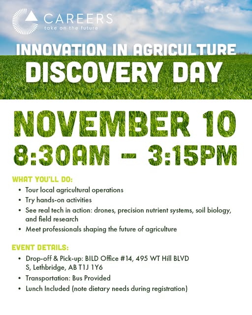 🌾 Innovation in Agriculture Discovery Day 🌾 Join us on November 10 for a hands-on exploration of how technology and innovation are transforming the future of farming! 🚜 Tour local agricultural operations 🤝 Meet industry professionals 📱 See real tech in action — from drones to soil biology research 🕣 8:30 AM – 3:15 PM 📍 Drop-off & Pick-up: BILD Office #14, 495 WT Hill Blvd S, Lethbridge 🍽️ Lunch provided (note dietary needs during registration) 🚌 Transportation included Don’t miss this chance to see the future of agriculture up close! Sign Up Today: https://loom.ly/ytWH2lg #CAREERS #TakeOnTheFuture #Agriculture #Trades #Innovation #DiscoveryDay #Lethbridge (fb)