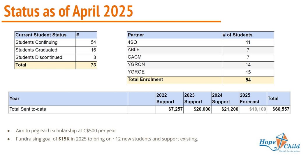 Proud to share that since launching in 2021, the program has supported 73 students - including 16 graduates & 54 actively enrolled students. These scholars span an array of fields, from civil engineering to aquatics technology to construction and sociology. Altogether, we have invested more than C$66,500+ in direct funding for students representing 31 different hometowns and villages. We are launching a campaign to raise funds to support more students for the next 2025 cohort. Please consider donating to help financially disadvantaged students improve their career prospects, bettering themselves, their families and communities. To donate to this please click below! We are aiming to raise $20,000 CAD - together let's help support more deserving young people achieve a higher education! https://www.canadahelps.org/en/dn/131110 If you have any questions or want to chat more about the program please reach out! (fb)