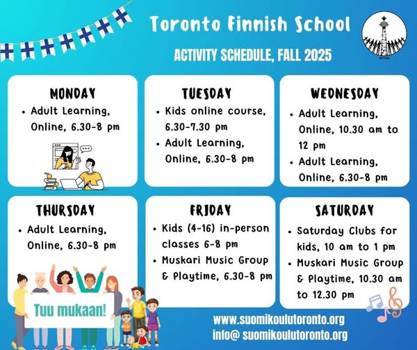 Weekly schedule at our Finnish School! Our calendar is filled with exciting Finnish language and culture classes. In addition to the courses, we also organize various events and celebrations throughout the year. There are still a few spots available in some of our groups! For more information, contact: - General inquiries and activities for children: info@suomikoulutoronto.org - Adult education: minna@suomikoulutoronto.org - Or visit the website: www.suomikoulutoronto.org Nähdään Suomi-koululla! (fb)
