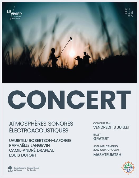 Rejoignez-nous ce vendredi à Mashteuiatsh pour le concert Atmosphères sonores électroacoustiques! Les artistes Uauietilu Robertson-Laforge, Raphaëlle Langevin, Camil-André Drapeau et Louis Dufort présenteront les œuvres réalisées pendant l'atelier en collaboration avec Akousma et Puamuna - Activités Art-Thérapie (fb)