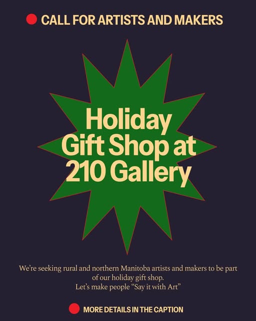 Every winter, 210 Gallery transforms into a space for local creativity — filled with small works that make meaningful gifts. This year, we’re inviting rural and northern Manitoba artists and makers to be part of our Holiday Gift Shop. If you create prints, cards, ceramics, jewellery, or other handmade pieces, we’d love to showcase your work. To apply, please send the following to marketing@mbartsnet.ca by October 24, 2025: – 2–3 photos of your items – Dimensions – Price range – Quantities available – Your name and contact information All works will be accepted on consignment, and artists must hold a current Manitoba Arts Network (MAN) membership. This Christmas, let’s help people say it with art. (fb)