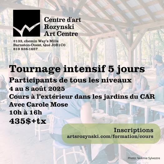 🌿 Plongez dans l'univers de la céramique au Centre d'art Rozynski ! Du 4 au 8 août, vivez une expérience artistique immersive avec un tournage intensif de 5 jours guidé par la talentueuse Carole Mose. Les cours ont lieu à l'extérieur, sous le pavillon, entourés de nature — une vraie bouffée d'inspiration 🎨💫 Ouvert à tous les niveaux, débutants comme passionnés. 🕙 Horaire : 10h à 16h 🔗 Infos et inscription : artsrozynski.com/formation/cours Rejoignez-nous pour une semaine créative, conviviale et enrichissante ! #CentreDartRozynski #AtelierCeramique #CaroleMose #ArtEnPleinAir #TournageIntensif #JardinsDuCAR --- 🌿 Dive into the world of ceramics at the Rozynski Art Centre! From August 4 to 8, enjoy a 5-day immersive pottery experience led by the talented Carole Mose. Classes take place outdoors, under the pavilion, surrounded by nature — a true breath of inspiration 🎨💫 Open to all skill levels, from curious beginners to seasoned ceramic lovers. 🕙 Schedule: 10 a.m. to 4 p.m. 🔗 Info and registration: artsrozynski.com/formation/cours(https://artsrozynski.com/formation/cours) Join us for a creative, friendly, and enriching week! #RozynskiArtCentre #CeramicWorkshop #CaroleMose #OutdoorArtClass #IntensivePottery #RozynskiGardens #ArtTraining #CreativeGetaway (fb)