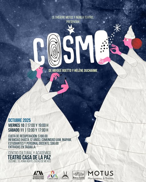 🧶✨ ¡Cosmo ✨🧶 de regreso en México! Nuestras dos tejedoras del tiempo vuelan una vez más para hacer soñar y reír al público mexicano. Primera parada: 📍 Centro Cultural y Académico Teatro Casa de la Paz – 4 funciones los días 10 y 11 de octubre de 2025 🎟️Para reservar tu lugar y pagar en el sitio, haz clic aquí: https://docs.google.com/forms/d/e/1FAIpQLSeg2LKcWd-g5-ApTXtdgIuMz0rHiCKX7EALLokNTrMzfuSrfQ/viewform 🎟️Para comprar tus boletos en línea, entra aquí: https://teatrocasadelapaz.uam.mx/cartelera/all/cosmo/ ------ 🧶✨ Cosmo ✨🧶 de retour au Mexique! Nos deux tisseuses de temps s’envolent à nouveau pour faire rêver et rire le public mexicain. 1e arrêt : 📍 Centro Cultural y Académico Teatro Casa de la Paz – 4 représentations les 10 et 11 octobre 2025 🎟️Pour réserver votre place et payer sur place c’est ici : https://docs.google.com/forms/d/e/1FAIpQLSeg2LKcWd-g5-ApTXtdgIuMz0rHiCKX7EALLokNTrMzfuSrfQ/viewform 🎟️Pour acheter vos places en ligne c’est ici : https://teatrocasadelapaz.uam.mx/cartelera/all/cosmo/ (fb)