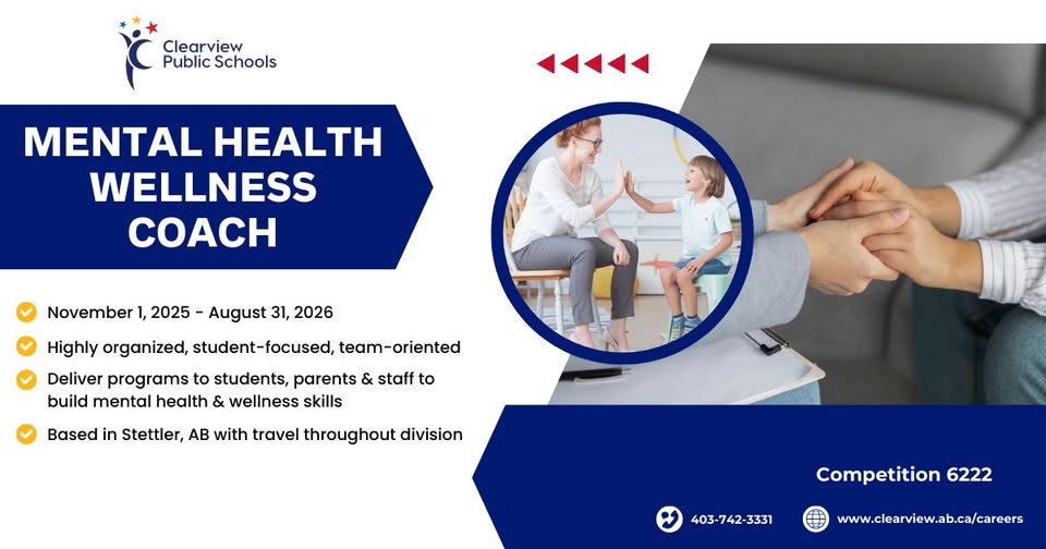 🌟 We’re Hiring! Mental Health Wellness Coach 🌟 Clearview Public Schools is seeking a temporary, part-time Mental Health Wellness Coach (0.7 FTE) for the CARS (Caring and Resilient Students) Mental Health Capacity Building program. 📍 Location: Based in Stettler, AB with travel throughout the division 📅 Start Date: November 1, 2025 (or earlier) 🕒 End Date: August 31, 2026 (includes summer hours) In this role, you’ll: ✔️ Deliver universal programs to students, parents, and staff on mental health and wellness ✔️ Support resiliency, knowledge, and positive school communities ✔️ Collaborate with a passionate team to promote student success Qualifications: 🎓 Post-secondary degree in Social Work, Psychology, or related field (diploma may be considered) 🚗 Valid driver’s license (travel required) 💡 2+ years experience in addiction or mental health preferred 💵 Competitive salary + Health & Wellness Spending Account. 👉 Apply by sending your resume and three references to apply@clearview.ab.ca, quoting competition #6222. 📌 Applications received by September 2, 2025 will be given priority. We All Belong – We All Succeed (fb)