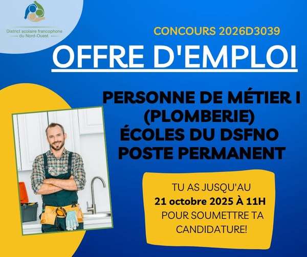 🚿 Possibilité d’emploi au DSFNO – Personne de métier I (Plomberie) Le DSFNO cherche une personne de métier I (plomberie) pour un poste permanent dans la région d’Edmundston et du Haut-Madawaska! 💧 Travaille dans un milieu stimulant, au service de nos écoles! 💼 Salaire : 30,06 $/h 📅 Date limite : 21 octobre 2025 à 11 h 👉 Candidature : dsfno.rh@nbed.nb.ca Pour plus de détails, rendez-vous ici : https://dsfno.nbed.ca/emplois/concours-ouverts-au-public/ Apprendre aujourd'hui, créer demain 📚✨ #DSFNO #Emploi #Plomberie #RégionEdmundston #HautMadawaska (fb)