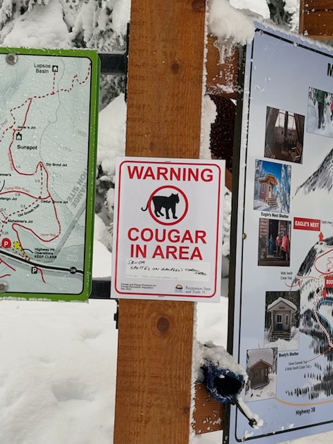 Be aware that a skier and dogs recently encountered a cougar on Maureen's Thrill, during daylight hours; the cougar did not immediately leave -- thought about it for a moment or two first. It's unusual to see a cougar out in daylight -- they're around, but they usually choose not to be seen. Rumours also indicate that the remains of a snowshoe hare were evident on the route between Red Dog and Mosquito. (fb)