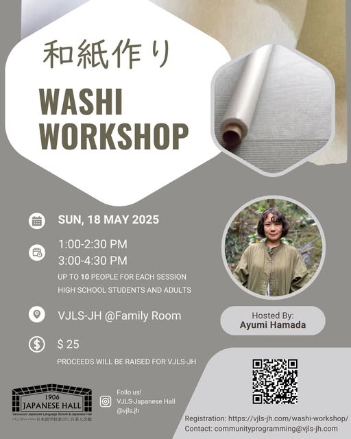 🎨 Washi-making Workshop on May 18th! 🗓️🇯🇵 We’re excited to host a hands-on washi-making workshop where you’ll create your very own washi paper from scratch! 🧻💧✋ Learn all about Tosa washi culture from Ayumi Hamada(@ayumi5127)—owner of Kashiki Washi(@washiplus) and founder of Washi+, a creative initiative that uses performing arts to spread the charm of washi! 🎭📜✨ 📍 This is a rare and unique Japanese cultural experience in Vancouver you don’t want to miss! 🇨🇦🌸 🧑🎓 Open to high school students and older 🎟️ Participation fee: $25 👥 Limited to 10 participants per session – register early! 🕐 Date: Sunday, May 18th 📌 Session 1: 1:00 PM – 2:30 PM 📌 Session 2: 3:00 PM – 4:30 PM 🔗 Sign up from the bio 💖 All proceeds go toward supporting the Vancouver Japanese Language School and Japanese Hall's facility maintenance and operations 🏫 📣 和紙づくりワークショップ開催! 🗓️✨ バンクーバー日本語学校並びに日系人会館(VJLS-JH)では、5月18日(日)に 和紙づくりワークショップを開催します! 👩🏫講師は、高知県で「鹿敷製紙」を経営し、 舞台芸術を通じて土佐和紙の魅力を広める活動「Washi+」を行っている 浜田あゆみ先生です 🧻ワークショップでは、 ✅ 土佐和紙の文化を学び ✅ 和紙の作り方を一から体験できます! 👉 自分だけのオリジナル和紙を作ってみましょう✨ 🌸バンクーバーではなかなか体験できない、貴重な日本文化体験です! 🔗 お申し込みはプロフィールbioより! 🗓️日程:5月18日(日) 🕐午後の部 1時〜14時30分 🕒午後の部 3時〜16時30分 🎟️参加費:25ドル 🎓対象:高校生以上 🚨**定員は各回10名まで!**お早めにご予約ください📝 💖 収益は、本団体の施設維持・運営費用のためのファンドレイジングに活用されます🏫✨ #vjlsjh #日本語学校 #バンクーバー #canada #バンクーバー生活 #Japanesearts #craftlesson #washipaper #workshop #washiplus #paper (fb)