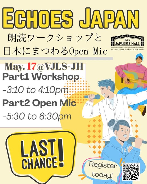 🎤 Presented by Soramaru Takayama (@soramaru_takayama) – a poet based in Vancouver. We are pleased to announce 📣 that we will be hosting: ✨ “A Workshop on Poetry Reading / A Japan Related Open Mic” 📅 May 17th, 2025 (SAT)! 1️⃣ Workshop 📖 Poetry reading aloud 📚 Manga reading aloud 2️⃣ Open Mic 🎭 You will be handed the stage to freely perform and showcase aspects of Japanese culture! 🎤 Sing a song, 🎶 play an instrument, 💃 dance with music, 🏯 perform traditional arts — anything related to Japan is welcome 🇯🇵❤️ Your act doesn’t need to be sophisticated — just show off your passion and love for Japan! 🗣️ Workshop will be primarily in Japanese, but all are welcome 🌏😊 📍 Date: Saturday, May 17th, 2025 🏫 Place & Time: Workshop :3:10 pm – 4:10 pm ➡️ 3rd floor, classroom #305 Open Mic :5:30 pm – 6:30 pm➡️ 4th floor, classroom #416 💸 Fee: FREE! 🎉✨ There will be snacks 🍘🍵 👥 Open to: Workshop: students & parents of VJLS-JH Open Mic: general visitors are welcome! 🙌 📲 Please complete your registration before attending via the link in our bio! 🔗 あなたの"にほん"を伝えてみませんか🎤/ 📅 VJLS-JHでは5月17日(土) に、 📖「朗読ワークショップと日本にまつわるOpen Mic」を開催します! 🎭イベントは2部構成🎭 📝 第1部:朗読ワークショップ 詩や漫画を題材に、✨表現豊かな朗読のコツ✨を言葉のプロがレクチャーします! 子供から大人まで、楽しみながら「心を揺さぶる日本語」を体感できます📚💫 🎤 第2部:Open Mic 🎶 日本に関することならなんでもOK! アカペラ🎵、楽器演奏🎷、ダンス💃、伝統芸能🏯、カラオケ🎤、漫才🤣など、ジャンルは自由! 上手じゃなくても大丈夫🙆♀️✨ あなたの隠れた才能をこの舞台で輝かせよう🌟 🗓️ 開催日:2025年5月17日(土) 🏫 会場&時間: ワークショップ :3:10pm〜4:10pm ➡️ 3階 305教室 オープンマイク :5:30pm〜6:30pm ➡️ 4階 416教室 🎟️ 参加費:無料!スナックもあります🍘☕ 👥 対象: 朗読会 ➡️ 本学生徒、および保護者様 Open Mic ➡️ 本学関係者に加え、一般参加もOK! 📲 参加方法: 事前登録の上お越しください!Walk-inも大歓迎🙌 🔗 登録はプロフィールのリンクから! #openmic #japaneseculture #japaneselearner #openmic #vancouverevents #japanesecanadian #vancouver #vjlsjh #vjls #バンクーバー #日本語学校 #vancouverbc #バンクーバー生活 #にほんご #にほんごべんきょう #にほんごきょうしつ #poetry #poetsociety #poetryreading #workshop #shareyourstory (fb)