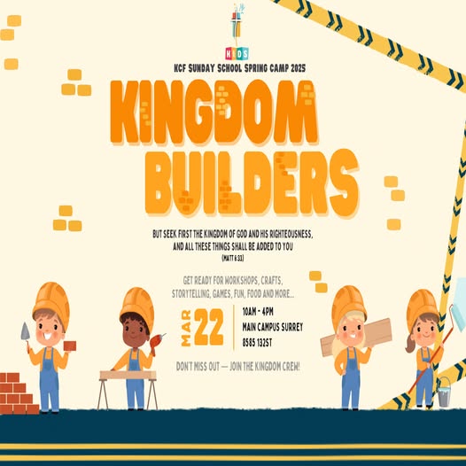 We are thrilled to announce our upcoming Spring Camp at KCF with the theme Kingdom Builders! 👑✨ This year, we’re focused on teaching kids how to build their lives on a strong foundation of faith and stand firm as part of God’s kingdom — no matter what challenges come their way 🧱 🗓️ Date: March 22nd 🕘 Registration: 9 AM ⏰ Program Start: 10 AM 🕓 End Time: 4 PM 📍 Location: Main Campus, Surrey The day will be packed with fun and engaging activities for children of all ages — from arts and crafts, exciting games, interactive workshops, music, and so much more! 🎶🎨 We would love to have your child join us for this exciting day of learning, fun, and fellowship! Please RSVP by registering at this link to secure your child’s spot. 👶 Minimum Age: 4 years 🍽️ Food and snacks will be provided for all attendees. Thank you for sending your little Kingdom Builders to this camp — together, let’s help them grow in faith and build God’s kingdom! 🏗️💛 Register: https://kcfv.churchcenter.com/registrations/events/2821892 (fb)