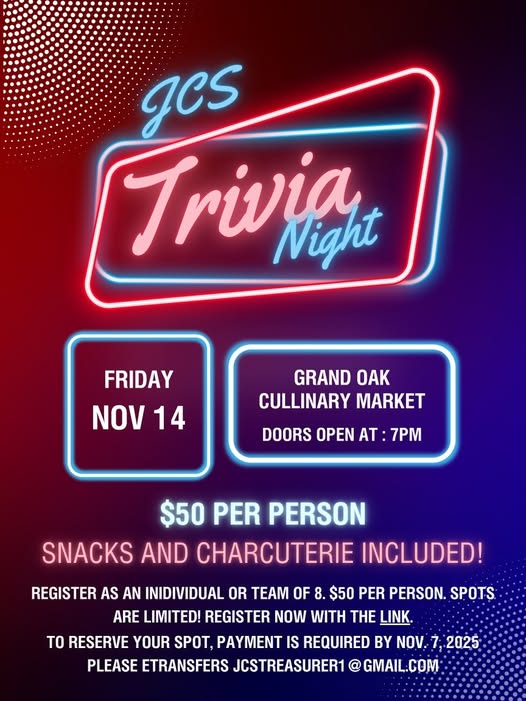 🧠✨ TRIVIA NIGHT is coming! Join us for an evening of fun in support of JCS. 📅 Friday, Nov 14 🕖 7:00 PM 📍 Grand Oak Culinary Market Come solo, as a couple, or rally a team of 8! 🔗 Register now using this link. https://docs.google.com/forms/d/e/1FAIpQLSdBnapShOjK2mBvocW29rFUMP_tMQcgtX9mF8TbgoQ6UCr-GQ/viewform?usp=dialog (fb)