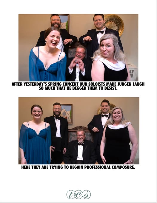 Letting off some steam after our glorious Spring Concert of Schubert and Mozart are the brilliant soloists, Kendra Dyck, soprano, Catharin Carew, mezzo soprano, Ross Mortimer, tenor, Alan MacDonald, baritone. Thanks for the stunning performances from our soloists and Players. With help from our large, enthusiastic audience, spring has sprung! (fb)