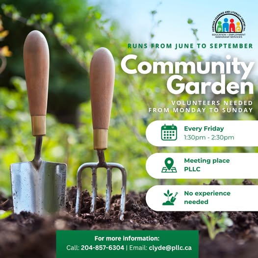 🌻 Join Our Community Garden! 🌿 Calling all green thumbs—and even those without! No experience needed! Help us grow something beautiful together at the PLLC Community Garden, running from June to September! 🌱 Whether you're looking to meet new people, enjoy the outdoors, or give back to the community, this is the perfect place to start! 🗓️ Every Friday | 🕜 1:30 PM – 2:30 PM | 📍 Meeting Place: PLLC ✅ No experience needed ✅ All ages welcome ✅ Volunteers needed Monday to Sunday! 📞 For more info, call 204-857-6304 📧 Email: clyde@pllc.ca Let’s grow, connect, and thrive—together! 💚 #CommunityGarden #VolunteerTogether #GrowWithUs #PLLC (fb)