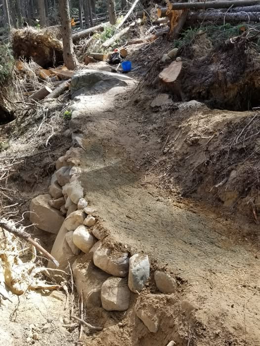 KCTS Trail Crew Update July 18th 2025. This week we: Had the brush saws busy clearing parts of: - Redtop. - Redhead. - Claim Jumper trail corridor. - Sunningdale. - Aspen Loop. - Bluffs. - Rusty Chainsaw. - Seven Summits. - Upper Mxiɬp Xewílh / Cedar. - Cleared substantial amounts of windfall from Upper Mxiɬp Xewílh / Cedar and Seven Summits. - Cleared trees from BS & Sunningdale. - Removed root-balls and repaired tread on upper Milky Way (pictured) and Southern Cross. - Continued construction of the new Camozzi trail, our new intermediate machine built downhill mountain bike “flow” trail. - A reminder that the Broken Goat trail running race is scheduled for Saturday July 19th on the Seven Summits trail. Organizers are cooperating with and providing substantial financial support to the KCTS, which we’re investing back into the trails. (fb)