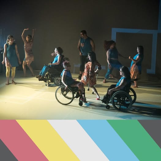 July is Disability Pride Month! At Propeller Dance, pride means celebrating disability as a powerful part of identity, something to express, embody, and move through with joy. As a disability and queer-led organization, we are proud every day to champion inclusive dance, challenge societal norms, and create spaces where all bodies belong. This month (and always), we honour the history, resilience, artistry, and activism of the disability community. Disability is not a limitation. It's a force of creativity, community, and change. Living the unDesireable Life by Artistic and Executive Director Emeritus and co-founder Renata Soutter Photo credit: Andrew Balfour Dancers (from left to right): Bella Bowes, Siôned Watkins, Moni Hoffman, Liz Winkelaar, Rob Chartier, Natalie, Amelia Rose Griffin, Sylvain Bouchard, Jess Huggett #disabilitypridemonth #disabilityjustice #inclusivedance #propellerdance Image Description: Here is the image description: A diverse group of dancers performs on a softly lit stage, showcasing a vibrant and inclusive contemporary dance scene. Some dancers are using wheelchairs, while others are standing or barefoot. They are all dressed in coordinated blue and orange-toned costumes with individual variations in cut and pattern. The dancers are actively engaged in expressive movement, with dynamic postures that convey energy, joy, and connection. The stage floor is marked with geometric white lines, and a large projection of intersecting white rectangles is visible on the backdrop. The atmosphere is intimate, immersive, and playful, with a warm, theatrical lighting that highlights the individuality and unity of the performers. A stylized Disability Pride flag spans the bottom of the image, featuring diagonal stripes in pink, yellow, white, blue, green, and gray, symbolizing disability identity and pride. (fb)