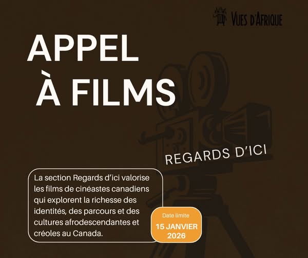 Cinéastes d’ici, c’est votre moment ! La section Regards d’ici met en lumière les films qui racontent les histoires, identités et cultures issues des diasporas africaines et créoles au Canada. Soumettez avant le 15 janvier 2026 ! https://form.zonefestival.com/?k=vda_f1lp Questions : adjprogrammation@vuesdafrique.org (fb)