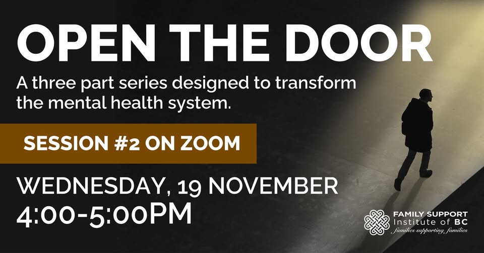The conversation on mental health services and supports in BC continues. In the first session of this series, we heard powerful stories from BC parents with children navigating the Child & Youth Mental Health system, and we introduced a framework for change. Now, we’re building on that foundation with a solutions-focused process that brings families, community leaders, and policymakers into honest dialogue. This next phase is about turning ideas into action—working together to improve access to mental health services in BC. Join us for Open the Door - Part 2 of this series: Wednesday, November 19, from 4:00-5:00pm Parents, families, self-advocates, leaders are all welcome to attend. Ahead of the session, we’ll share guiding questions to help participants reflect on system barriers and potential policy or practice changes. Register now: https://us06web.zoom.us/meeting/register/k7OxlnllQSuEZL_PuMYXBg (fb)