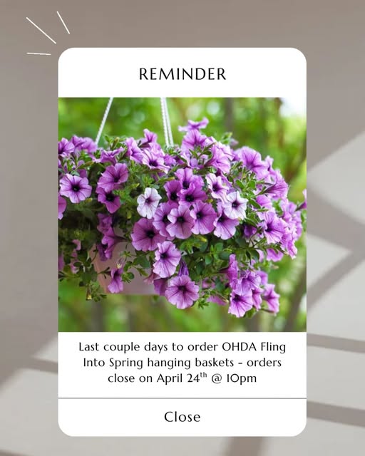 Only a couple more days left to order hanging baskets in support of the OHDA’s Fling Into Spring fundraiser! Don’t forget to place your order before April 24th at 10pm EST to ensure you get one of these colourful hanging baskets! (fb)