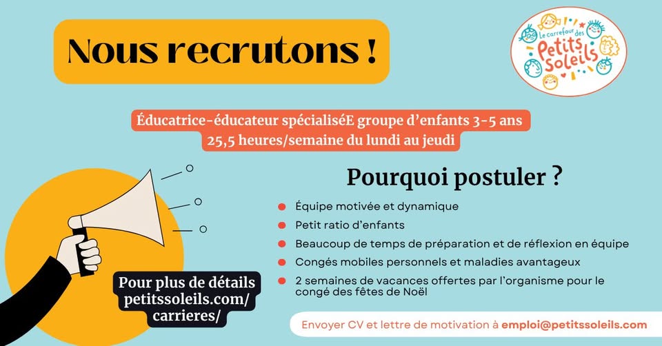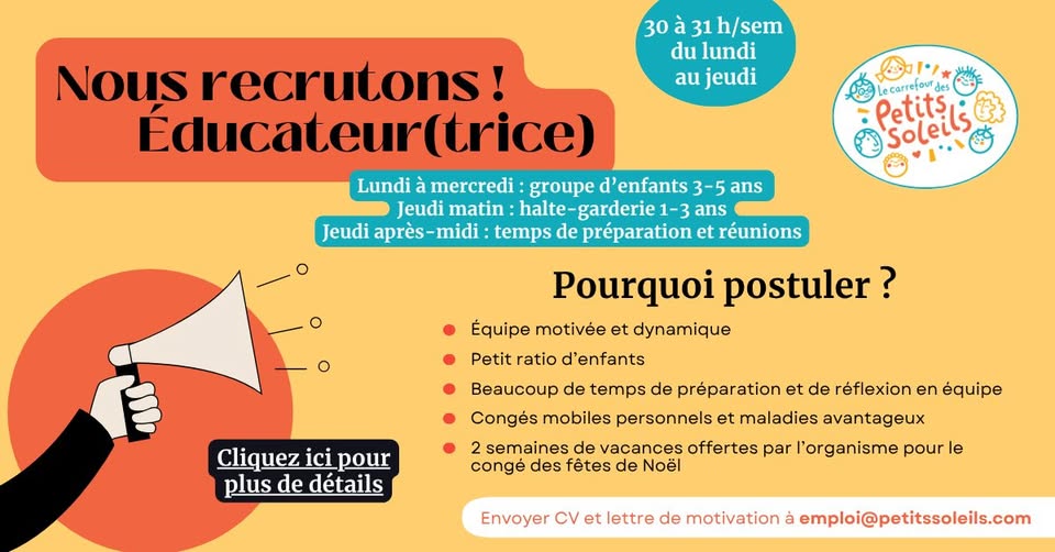 🚨🚨🚨 Le Carrefour recrute ! 🎯Éducatrice/éducateur groupe enfants 3-5 ans (3 jours) et halte-garderie 1-3 ans (1 matinée) 30 à 31 heures/semaine du lundi au jeudi Plus d'infos : https://drive.google.com/file/d/10ykyxHjoxz1jMoGisElfwN9CgCrm4o2c/view Envoyer CV et lettre de motivation à emploi@petitssoleils.com (fb)