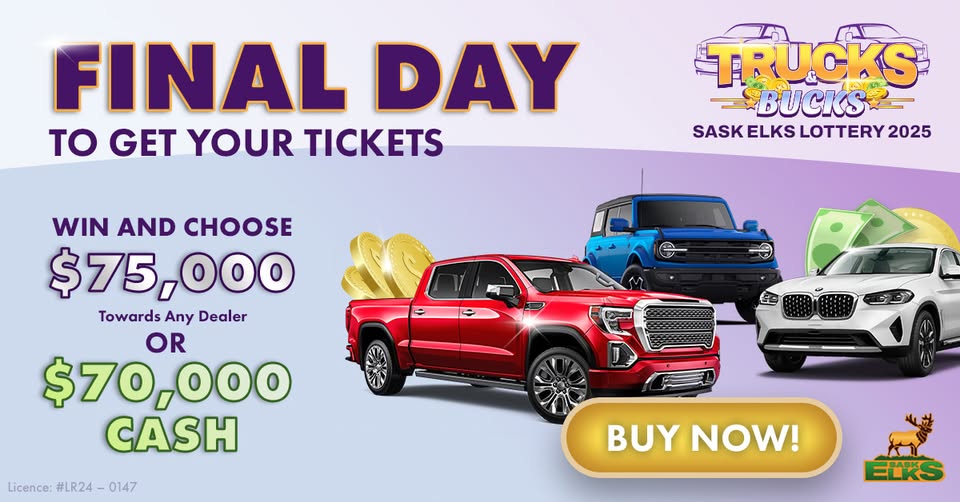 🎉 CONGRATULATIONS TO OUR 2025 TRUCKS & BUCKS LOTTERY WINNERS! 🎉 We’re thrilled to announce the lucky winners from this year’s Saskatchewan Elks Trucks & Bucks Lottery! 🚨 Thank you to everyone who supported the lottery and helped make a difference in children's lives. 🏆 WINNER ANNOUNCEMENTS 🏆 Here are this year’s major prize winners: Grand Prize Winner: Gary Blakley of Halbrite won his choice of $75,000 Credit towards a vehicle dealer or $70,000 CASH! 50/50 Jackpot Winner: Nicole Schindel of Rush Lake is taking home $49,737.50 CASH! Loyalty Prize Winner: Walter and Barb Sagen of Kenaston won a 5-night spa package At Temple Gardens Mineral Spa + $500 Dining Credit or $2,500 CASH! Early Bird Prize Winner: Kim & Darren Martin of Regina won an 8-day autumn vacation package in Montreal and Quebec City or $5,000 CASH! Vacation Prize Winner: Wes Friesen of Ardath won 5 Nights at Caesar’s Palace in Las Vegas! Vacation Prize Winner: Lois & Dale Howe of Moose Jaw won 5 Nights at Margaritaville Palm Springs! Vacation Prize Winner: Norma Palmer of Star City won 7 Nights at Disney’s All Star Movies Resort! Vacation Prize Winner: Don Wyatt of Bienfait won 5 Nights at Toronto’s Eaton’s Centre! Vacation Prize Winner: Ken Schmidt of Yorkton won 4 Nights at Fairmont Waterfront in Vancouver! Thanks to your incredible support, proceeds from this year’s lottery will help purchase specialized hearing equipment for children at the Jim Pattison Children’s Hospital in Saskatoon. Thank you, Saskatchewan! 🌾 Until next year! (fb)