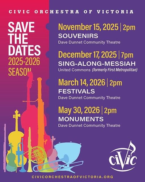 Get your tickets and mark these dates in your calendars! The Civic Orchestra proudly presents its 42nd season of spirited community music-making. Four fantastic concerts, with excellent discounts for students, seniors, and free tickets for children! We want to provide a live orchestral music experience for as many people in our community as possible. 🎶 Concert information and tickets can be found here: https://linktr.ee/civicorchyyj and on our website at https://www.civicorchestraofvictoria.org (fb)