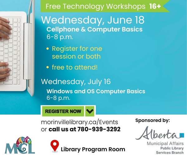 Don't miss out on our free in-person computer workshop happening this week 📍in the library! For ages 16+. Register for one, or both! 📅 Wednesday, June 18: Computer and Cellphone Basics 🕕 6-8 p.m. Learn the essentials of using smartphones and computers, including navigation, settings, internet safety, and troubleshooting. 💻 Bring your own devices 📅 Wednesday, July 16: Windows and OS Computer Basics 🕕 6-8 p.m A step-by-step introduction to using Windows computers, covering file management, system settings, troubleshooting, and essential features. For ages 16+. Call us at 780-939-3292 to REGISTER or go to our website Events Calendar to register online ➡️ https://morinvillelibrary.ca/Events ⭐ This workshop is sponsored by the Public Library Services Branch of Municipal Affairs. (fb)