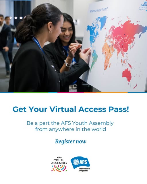 Be a part of the AFS Youth Assembly from anywhere in the world with our Virtual Access Pass! This option gives you access to: 💻 Live streamed daily plenaries and two daily select sessions from our 30th Session on August 9 and 10 from 9 AM - 1 PM EST 🌐 The official event platform to connect with other virtual participants from around the world 📜 An official AFS certificate of virtual participation recognizing your engagement 🤝 An invitation to join the global Alumni Impact Network of the AFS Youth Assembly Register now www.youthassembly.org/virtual-access-pass (fb)