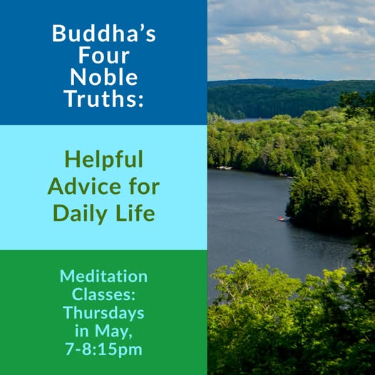 Tonight! Thurs May 15th, 7-8:15pm: Buddha's Four Noble Truths - Helpful Advice for Daily Life Meditation Class in Downtown Kingston Navigating life’s problems is challenging in these modern times, and we often hear and receive different kinds of advice. You might want to consider what Buddha Shakyamuni had to say about it all. His first teachings were called "The Four Noble Truths" in which he spelled out why we suffer, and how to achieve both temporary and lasting peace. Everything he subsequently taught could be included within these four basic principles: True sufferings, true origins, true cessations, and true paths. With Buddhist nun and Resident Teacher Gen Chöyang. These classes are suitable for both beginners and more experienced meditators. Classes are self-contained, so feel free to drop in at any point in the series. Everyone is welcome! Classes are at The Spire (82 Sydenham St. inside the Sydenham St. United Church), Rm. 205, 2nd floor. For more info or to register: https://www.meditateinkingston.org/thursday-meditation-class (fb)