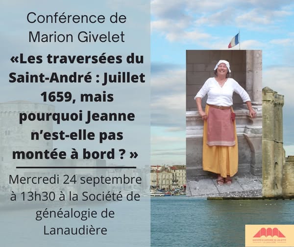 La Société d'histoire de Joliette-De Lanaudière et la Société de généalogie de Lanaudière vous convie à la conférence de l'historienne et géographe Marion Givelet « Les traversées du Saint-André : Juillet 1659, mais pourquoi Jeanne n'est-elle pas montée à bord ? » à la Société de généalogie de Lanaudière le mercredi 24 septembre à 13h30. Marion Givelet est historienne, géographe, guide-conférencière, conteuse et autrice jeunesse. Elle obtient sa maîtrise en histoire en juin 2000 à La Rochelle et une licence en géographie à Tahiti en 1998. Depuis 25 ans, elle est guide pour quatre offices du tourisme de la région de La Rochelle où elle anime en français et en anglais. Elle est aussi animatrice du patrimoine dans les tours de La Rochelle, guide musée de La Rochelle et elle a participé à plusieurs émissions radiophoniques et télévisuelles. Elle a été présidente et vice-présidente de l’Association Pays Rochelais-Québec pendant 10 ans et elle est présentement secrétaire générale adjointe de la Fédération France Québec Francophonie. Elle a aussi été administratrice de l’Association Salvare Campini qui mène depuis plusieurs années le projet de rétablissement de la sonnerie des cloches de l’église Saint-Sauveur de La Rochelle. Munie de son costume, Marion Givelet viendra nous présenter sa nouvelle conférence sous forme de conte et faits historiques. Coût : 25$ pour les membres de la Société d'histoire et de la Société de généalogie et 40$ pour les non-membres. Adresse : La Société de généalogie de Lanaudière, 200 boulevard de l’Industrie, Joliette, J6E 0E7 Inscription obligatoire à info@genealogielanaudiere.ca. Argent comptant et chèque seulement. (fb)