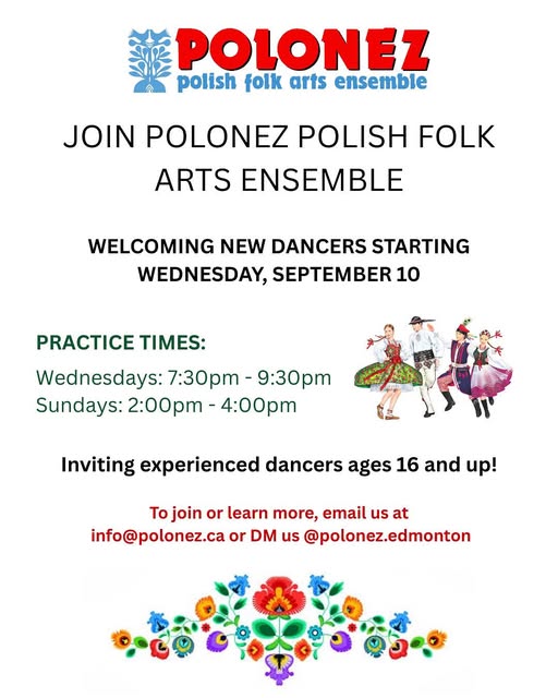 ✨ Polonez Polish Folk Arts Ensemble is welcoming new dancers! 💃🕺 📅 Practice Times: Wednesdays | 7:30–9:30 PM Sundays | 2:00–4:00 PM 📍 Ages 16+ with prior dance experience are invited to join our group. Interested? Reach out, we’d love to hear from you! ❤️🤍 📩 Email: info@polonez.ca 📲 Instagram: @polonez.edmonton ……………………………………………………………………… Polonez zaprasza nowych tancerzy! 💃🕺 📅 Próby: Środy | 19:30–21:30 Niedziele | 14:00–16:00 📍 Zapraszamy osoby w wieku 16+ z doświadczeniem tanecznym. Chcesz do nas dołączyć? Napisz do nas wiadomość lub wyślij e-mail! ❤️🤍 📩 Email: info@polonez.ca 📲 Instagram: @polonez.edmonton (fb)