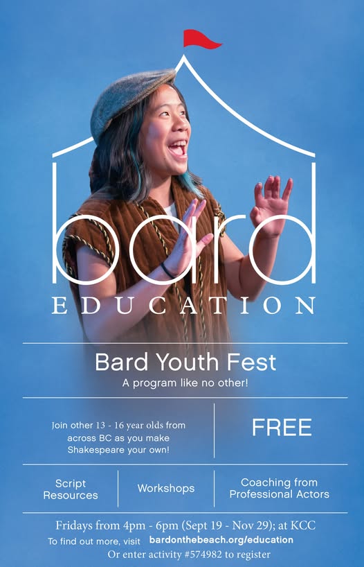 Bard Youth Fest Lab is about the thrill of experimentation and discovery that emerges when reimagining Shakespeare. Youth will learn about devising and directing from a professional Teaching Artist. At the end of the sessions they’ll get together with other troupes and share their short Shakespeare inspired piece. Final performance will be November 29 at the BMO Theatre Centre🎭 This multi-week program celebrates the infinite ways young people play, think about, and perform Shakespeare. Thanks to the generosity of our funders, the Pamela and David Richardson Family Foundation, participation is FREE. Sign up by Monday, September 15th. Activity number 574982. https://anc.ca.apm.activecommunities.com/vancouver/activity/search/detail/572060?onlineSiteId=0&from_original_cui=true (fb)