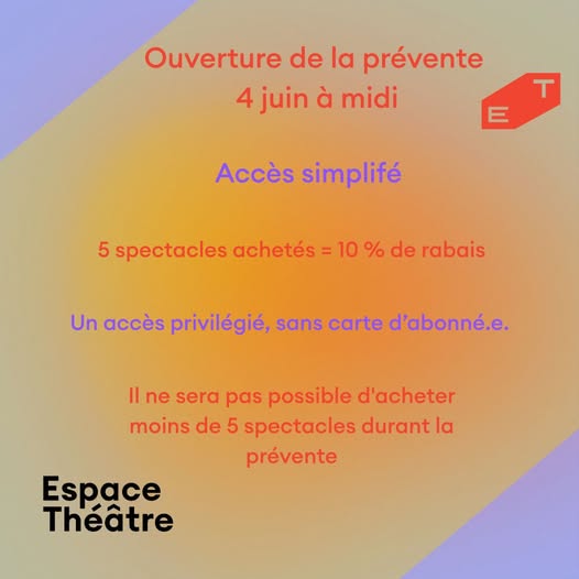 🎟️ PRÉVENTE – DU 4 AU 8 JUIN 𝑪’𝒆𝒔𝒕 𝒍𝒆 𝒎𝒐𝒎𝒆𝒏𝒕 𝒅𝒆 𝒑𝒍𝒂𝒏𝒊𝒇𝒊𝒆𝒓 𝒗𝒐𝒕𝒓𝒆 𝒔𝒂𝒊𝒔𝒐𝒏 𝒄𝒖𝒍𝒕𝒖𝒓𝒆𝒍𝒍𝒆 ! La prévente de la saison 2025-2026 de l’Espace Théâtre ouvre officiellement le 4 juin à midi ! ✨𝐋𝐚 𝐩𝐫𝐨𝐠𝐫𝐚𝐦𝐦𝐚𝐭𝐢𝐨𝐧 𝟐𝟎𝟐𝟓-𝟐𝟎𝟐𝟔 𝐞𝐬𝐭 𝐝é𝐬𝐨𝐫𝐦𝐚𝐢𝐬 𝐝𝐢𝐬𝐩𝐨𝐧𝐢𝐛𝐥𝐞 𝐞𝐧 𝐥𝐢𝐠𝐧𝐞 — explorez-la dès maintenant: https://espacetheatre.com/spectacle/programmation-2025-2026-2/ 👉 Procurez-vous 5 spectacles ou plus dans une seule transaction et profitez : ✔️ d’un rabais de 10 % ✔️ d’un processus simplifié (aucune carte ou inscription requise) 📍 𝐄𝐧 𝐥𝐢𝐠𝐧𝐞 ou en personne dans le grand hall à partir de midi. 📞 Les lignes téléphonique ouvriront à 14 h (notre équipe est très sollicitée, il est préférable de faire ses achats en ligne) ⏳ Faites vite : certains spectacles feront salle comble rapidement! 💡 La vente grand public débutera le 9 juin à midi. #EspaceThéâtre #Prévente #Saison2025 #Billetterie #MontLaurier #Spectacles #CulturePourTous (fb)