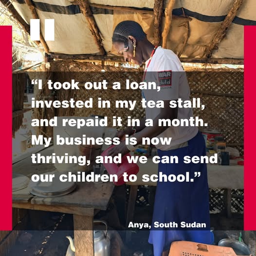 “I took out a loan, invested in my tea stall, and repaid it in a month. My business is now thriving, and we can send our children to school.” – Anya, South Sudan This is what community-led economic empowerment looks like. It's a main focus of our work toward providing opportunities in war-affected regions. Learn more from our 2024 Impact Report: https://www.warchildannualreports.com/2024annualreport #WomenInBusiness #RefugeeResilience #WarChildImpact (fb)