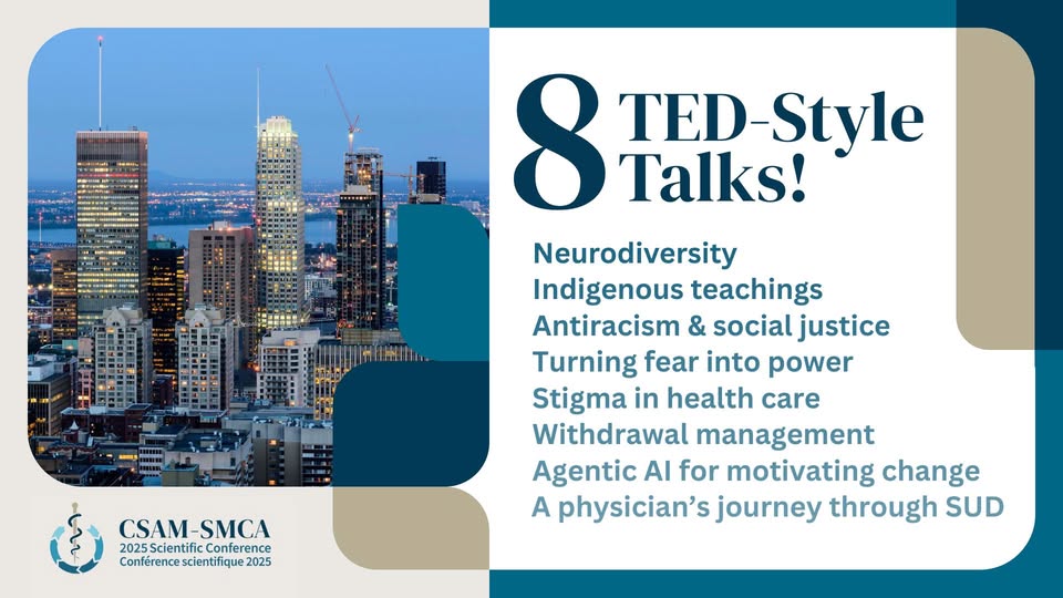We're excited to welcome you to Montreal this fall for the CSAM-SMCA 2025 Scientific Conference, featuring 8 incredible TED-Style talks — take a look! 👇🏼 🎤 Rethinking Recovery: Centering ADHD and Neurodiversity-Affirming Practice in Addictions Care — Maria Benedict 🎤 The "Wellness Wheel": A Sharing of a framework of how I reconcile as an Indigenous Provider: The balance of pharmaceutical and non-pharmaceutical ways of healing in substance use disorders and mental health conditions — Dr. Sheila Peters 🎤 Embedding Equity, Antiracism And Social Justice Into Clinical Practice is Needed Now More Than Ever: Working with Identity, Authenticity, and Allyship — Norman Kim 🎤 Turning Fear Into Power: How unconventional leadership creates unprecedented results — Scott Elliott 🎤 Barriers to Care: The Impact of Drug Use History on Healthcare Access - as told by a person who uses drugs — Charlotte Munro 🎤 Reimagining Withdrawal Management in the Era of a Toxic Drug Supply: Lessons from the Road to Recovery Initiative — Dr. Brittany Dennis 🎤 On Both Sides of the Glass: A Physician’s Journey Through Addiction — Dr. Amanda Moore 🎤 Agentic AI: Chatbots for motivating change in Addiction — Dr. Peter Selby See the full program here: https://csamconference.org/program/ #addictionmedicine #csamsmca2025 (fb)