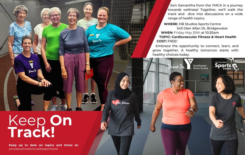 ❤️🏃♀️ Keep on Track: Cardiovascular Fitness & Heart Health 🏃♂️❤️ Join us Friday, May 30 at 10:30 AM at the HB Track for our next Keep on Track session! This month, we’re diving into Cardiovascular Fitness and Heart Health — learn simple ways to boost your endurance, strengthen your heart, and keep your body moving strong for life. 💪 ✅ Free and open to everyone ✅ Easy tips to support a healthy heart ✅ Gentle movement and education combined 📅 Date & Time: Friday, May 30th at 10:30am 📍 Location: HB Studios Sports Centre, 543 Glen Allan Dr, Bridgewater. 💲 Cost: FREE! Let’s walk, learn, and build a stronger heart together! 🏃♀️🚶♂️ #KeepOnTrack #HeartHealth #CardioStrong #MoveMoreLiveBetter #BridgewaterNS (fb)