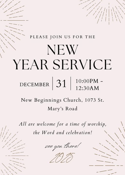 Ready to ring in the new year? You’re invited to our 2025 New Year Service!✨ Join us for a time of worship, word and praise on December 31st, 2024 at 10:00PM. Let’s celebrate together! 🎉 #newyears #newyearseve #2025 #churchservice (fb)