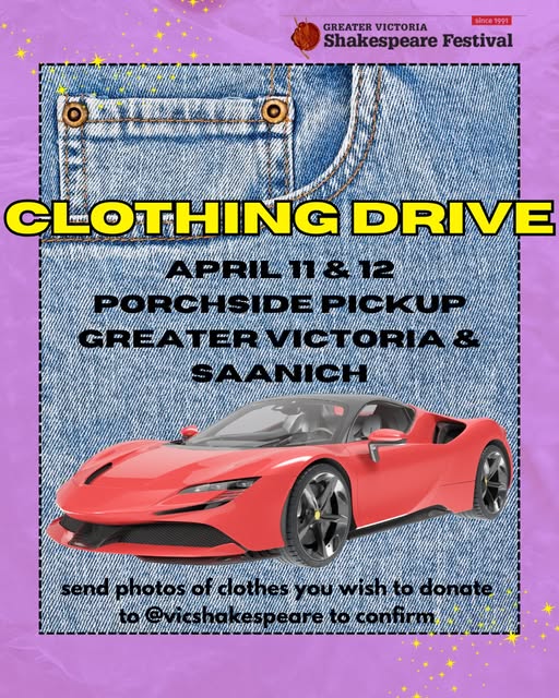 *BEEP BEEP* 🏎️ Clothing drive for our summer season of Romeo & Juliet! In a sustainable effort for our show this year, we thought it fitting to attempt for our set, props and costume pieces to be made as much out of recycled/up cycled material as possible. We will be coming around on April 11th & 12th to pick up any and all items you’d like to donate! We are looking for the following items: -formalwear/business-wear - black and white colour pallet preferred -denim -leather -plaid (flannels, not button down shirts) -jewelry! -tshirts - band t-shirts a plus! -buttons/patches you might see on a punk battle jacket -lace or crochet doilies -plain UNUSED cloth face masks If you wish to donate, please follow this protocol to create an easy system: Step 1: DM or email us a photo and/or description of what you have Step 2: Wait for a reply with more details with the option of porchside pickup if you live within the Greater Victoria / Saanich area, or an address for you to drop off in Oak Bay at your leisure. Step 3: Have your items be used in a beautiful show with themes of post-apocalyptic climate disaster! (fb)