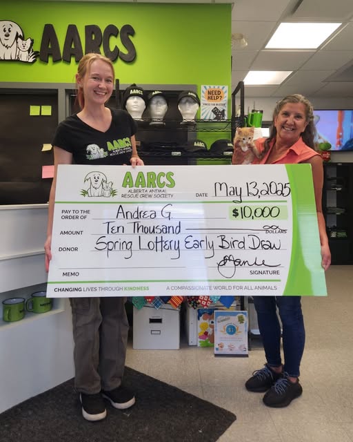Psst... Andrea took home a whopping $10,000 as our Spring Cash Lottery early bird winner this week, and YOU could be the next one smiling this big! 😁 Get your paws on tickets for the remaining $40,000 in cash prizes, and don't forget the bonus 50/50 draw! The jackpot is over $26K and growing every day. 🤑 Your ticket isn't just your chance to win: it's a new leash on life for a rescued animal in need. 🐾 Fetch your tickets today at aarcs.ca/chances! ✨ #AARCS #SpringCashLottery #WinnerWinner (fb)