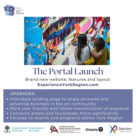 The York Region Arts Council is thrilled to announce the relaunch of www.ExperienceYorkRegion.com featuring the Artist Portal! The Artist Portal is a digital hub for the art community in York Region. The Artist Portal provides individual artists, artist collectives, and arts organizations the opportunity to connect and grow their network in a significant way. It is also a tool for the broader York Region community, Municipalities, and local businesses to connect with artists in a more meaningful way with the goals of increasing awareness and infusing arts and culture within our communities through increased opportunities for artists, new connections, and promotional capabilities. Check it out today to learn more! (fb)