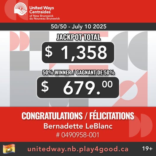 🚨 WINNER ANNOUNCEMENT 🚨 🎉 Congratulations to Bernadette! 🎟️ Winning Ticket: #0490958-001 💰 Prize: $679 💛 Total Prize Pool: $1358.00 Huge shout-out to everyone who grabbed a ticket! Every single one fuels change right here at home. Join the movement: unitedway.nb.play4good.ca 🚨 ANNONCE DU GAGNANT 🚨 🎉 Félicitations à Bernadette ! 🎟️ Billet gagnant : #0490958-001 💰 Montant : 679 $ 💛 Cagnotte totale : 1358.00 $ Un immense merci à tous ceux qui ont acheté un billet ! Chaque billet alimente le changement ici même, chez nous. Rejoignez le mouvement : unitedway.nb.play4good.ca - Must be 19+ and a resident of NB #ThePowerofYou #community (fb)