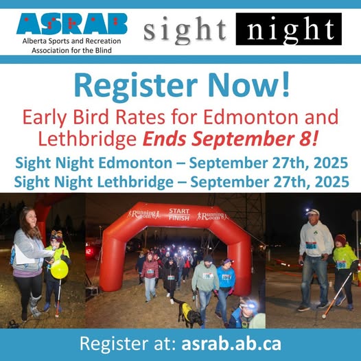 There is still time to save money by registering early for our Sight Night events! This is a reminder that the Early Bird Rates for Edmonton and Lethbridge Sight Night events end on September 8! Register Now! Sight Night Edmonton – September 27th, 2025 Sight Night Lethbridge – September 27th, 2025 Register here: https://asrab.ab.ca/?page_id=13 (fb)