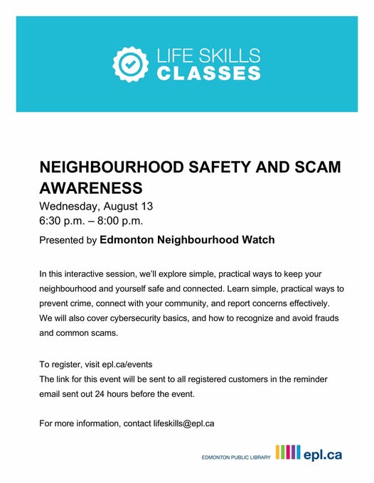 Neighbourhood Safety and Scam Awareness Workshop at Edmonton Public Library Edmonton Public Library - Online Workshop Join Edmonton Neighbourhood Watch for an important and interactive online session to learn how to keep yourself and your neighbourhood safe! 🗓️ Date: Wednesday, August 13, 2025 ⏰ Time: 6:30 p.m. – 8:00 p.m. 📍 Location: Online (Link sent to registered participants 24 hours before event) In this session, you’ll discover: ✅ Practical ways to prevent crime ✅ How to connect with your community ✅ How to report concerns effectively ✅ Cybersecurity basics and how to recognize and avoid frauds and common scams. Whether you’re a student, parent, senior, or new resident, your everyday actions can help build a safer Edmonton! 👉 Register now at epl.ca/events 📧 For more info, contact: lifeskills@epl.ca #EdmontonNeighbourhoodWatch #YegSafety #ScamAwareness #CommunitySafety #Cybersecurity #EdmontonEvents (fb)