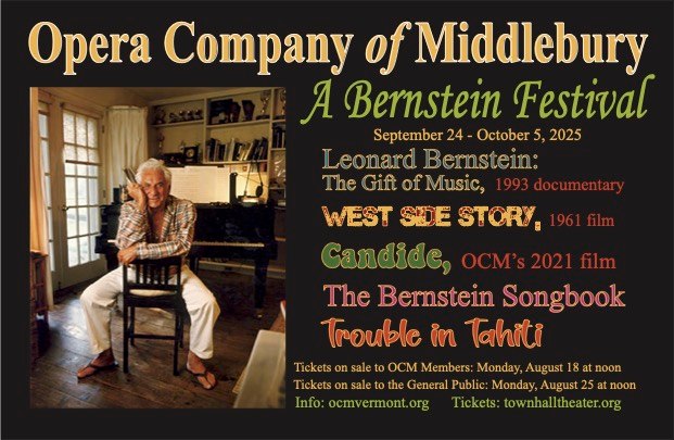 🎉 For the first time ever, OCM is putting on a festival! A composer as legendary as Leonard Bernstein deserves nothing less than an all out celebration. 🎉 Get ready for an incredible lineup of films and talks, all leading up to our spectacular mainstage production of A Bernstein Songbook + Trouble in Tahiti! 🎟️ MEMBER EXCLUSIVE: Tickets are available NOW for OCM members! 📅 Sale to the general public: Monday, August 25 Want early access? There's still time to join as a member and secure your tickets before everyone else! ocmvermont.org/membership See you there! ✨ (fb)